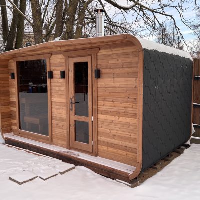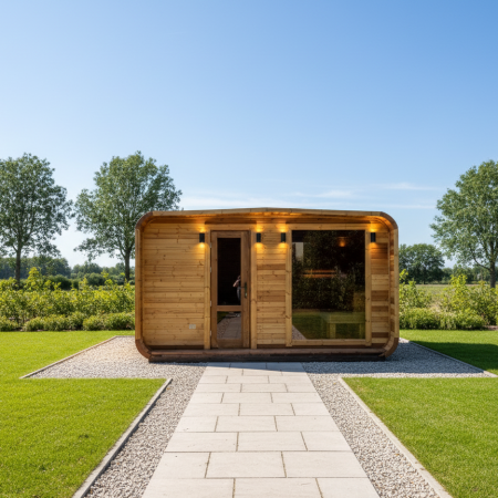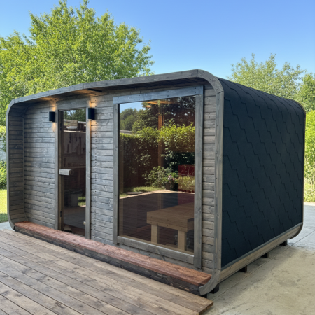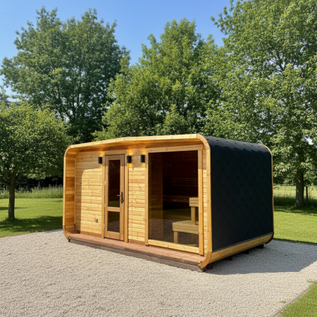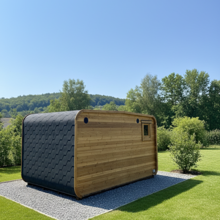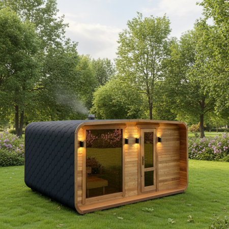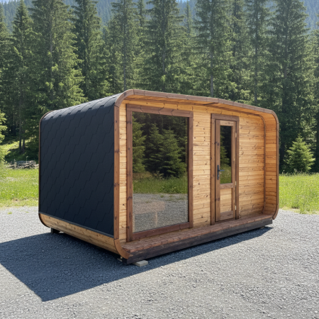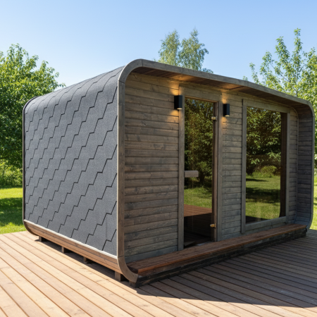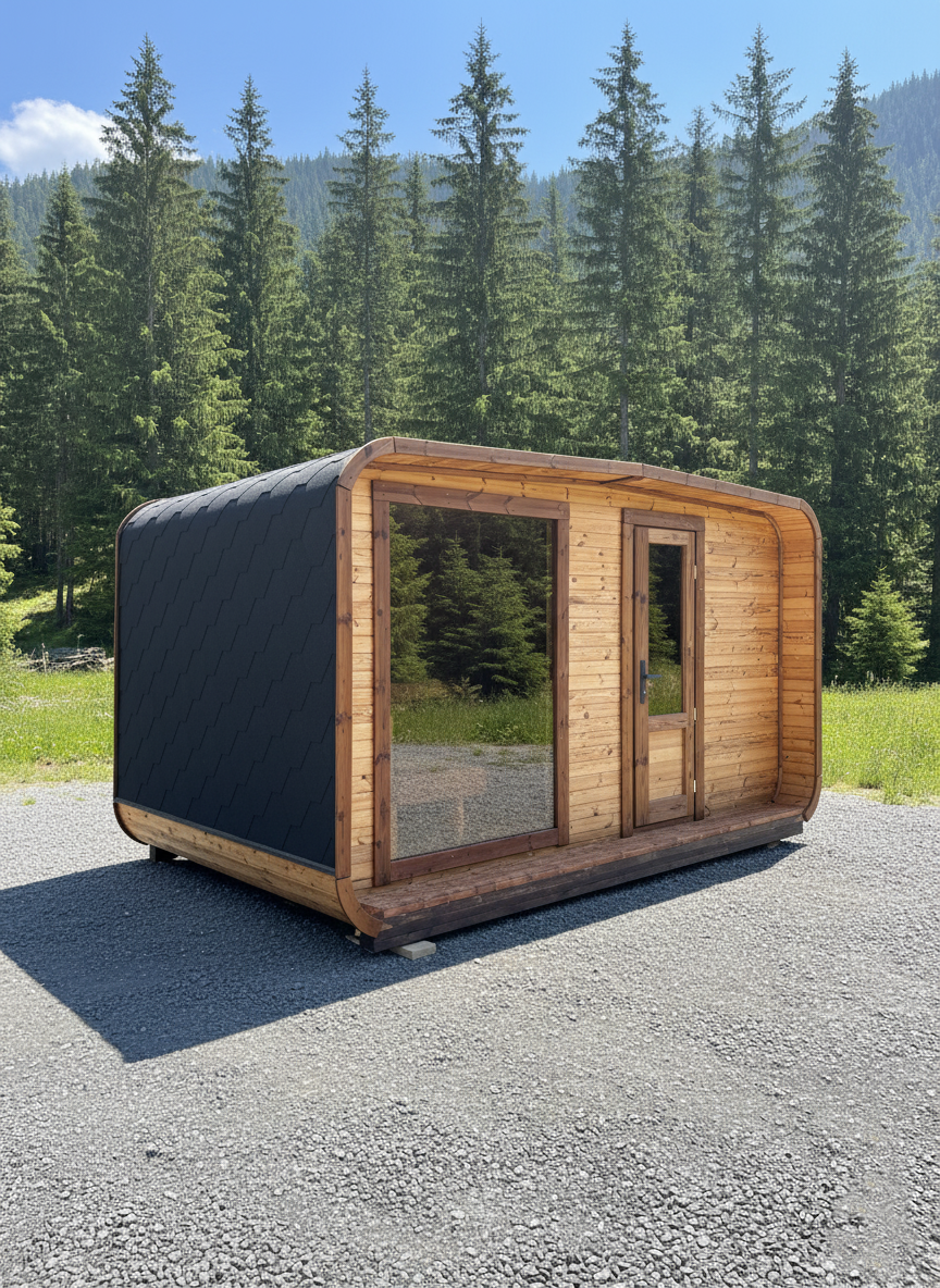 architecture contemporaine aux lignes épurées et ses finitions soignées. Sa structure en thermowood garantit une parfaite isolation et une esthétique chaleureuse qui s’intègre naturellement dans tous les décors : jardin, terrasse, gîte ou chalet.