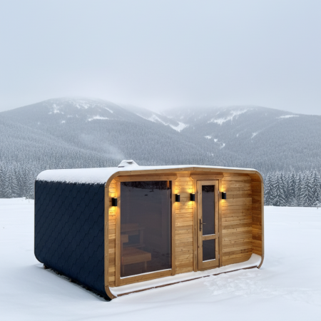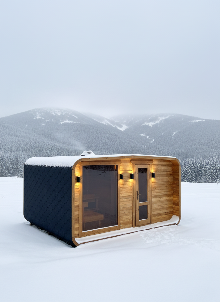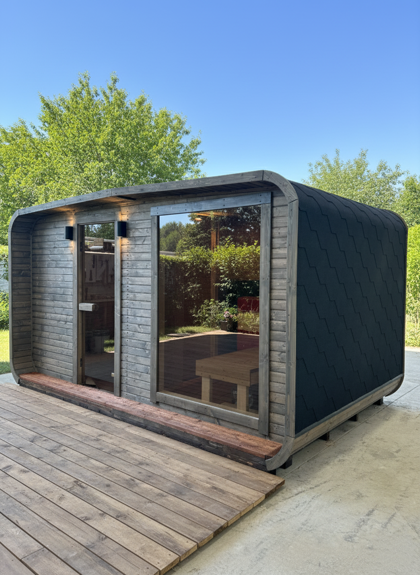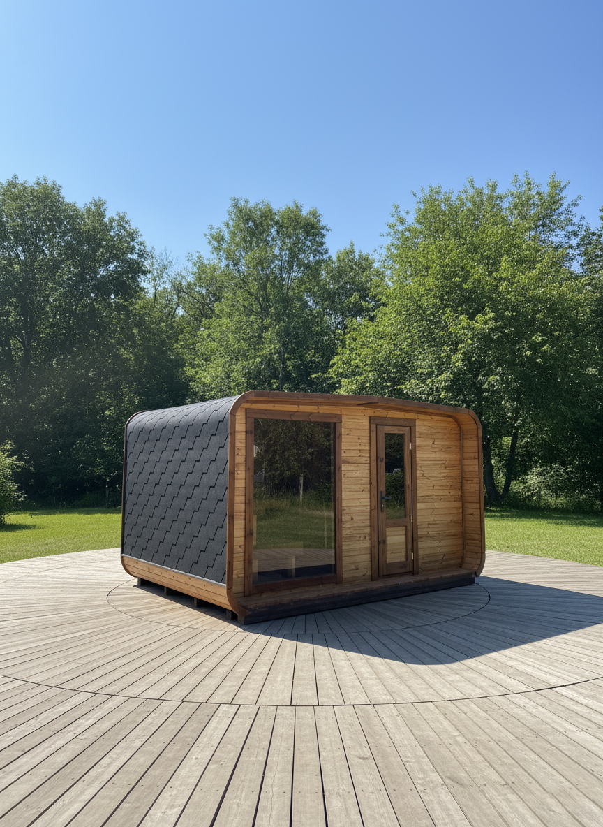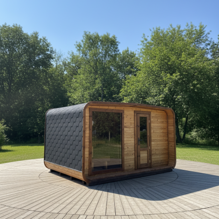 sauna Cube Horizon. Alliant design moderne et chaleur authentique, ce sauna haut de gamme est pensé pour offrir une expérience unique grâce à sa