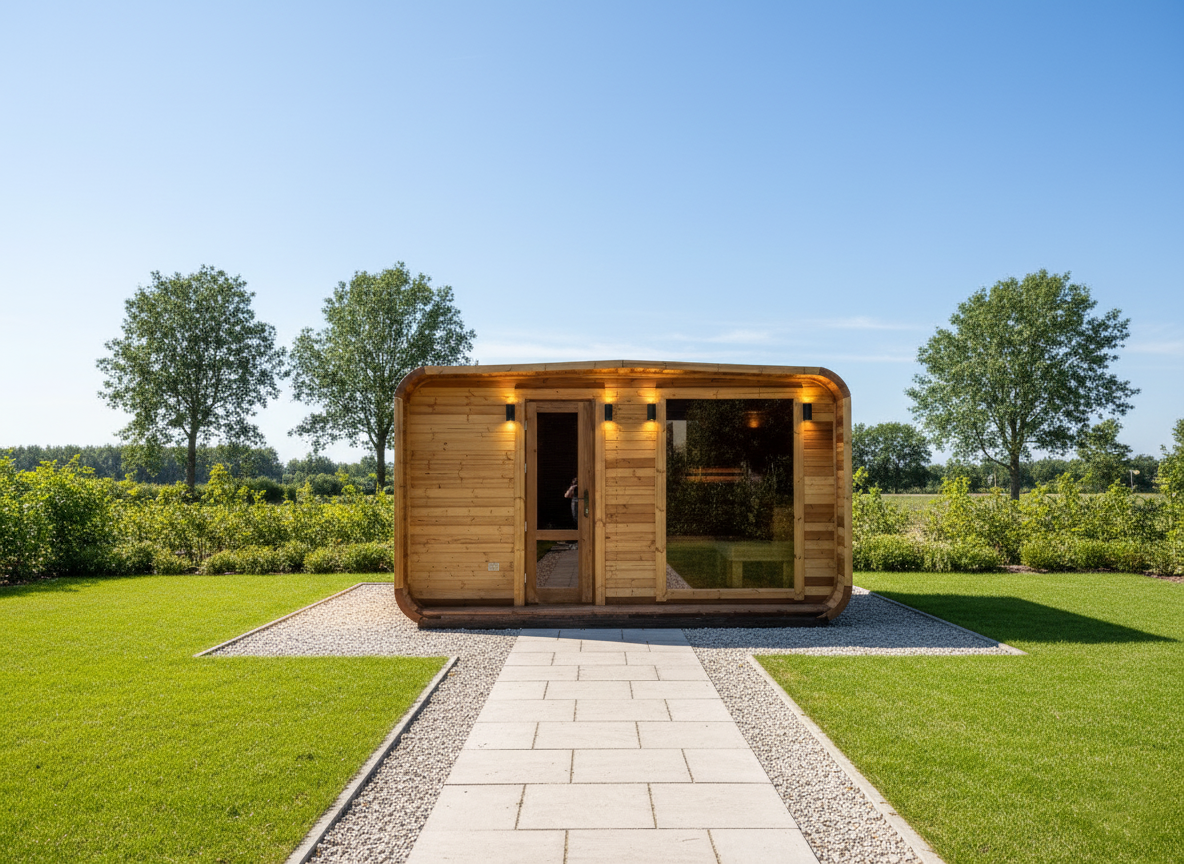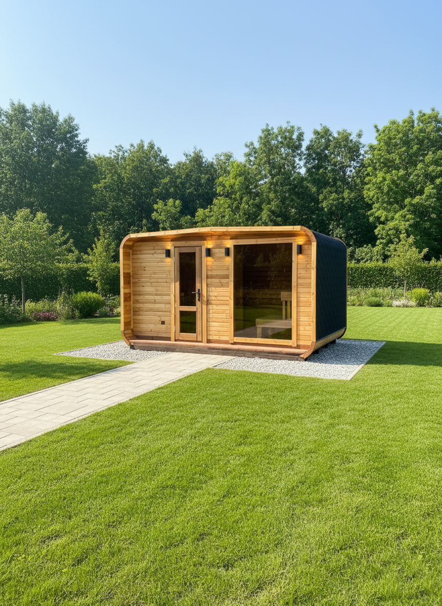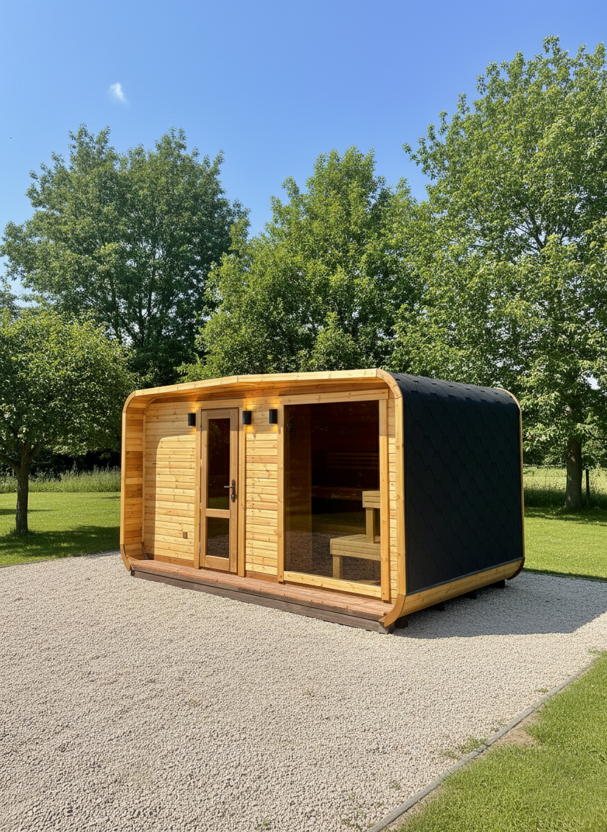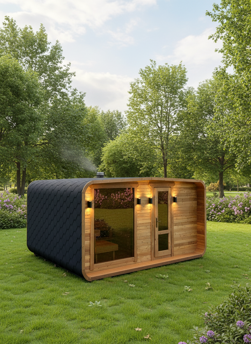 sauna Cube Horizon. Alliant design moderne et chaleur authentique, ce sauna haut de gamme est pensé pour offrir une expérience unique grâce à sa