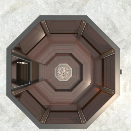 HELE MEDIUM, est un modèle unique offrant une vue à 360°C faisant disparaître complètement les frontières entre les murs et le paysage. Le sauna se dissout visuellement et devient invisible.