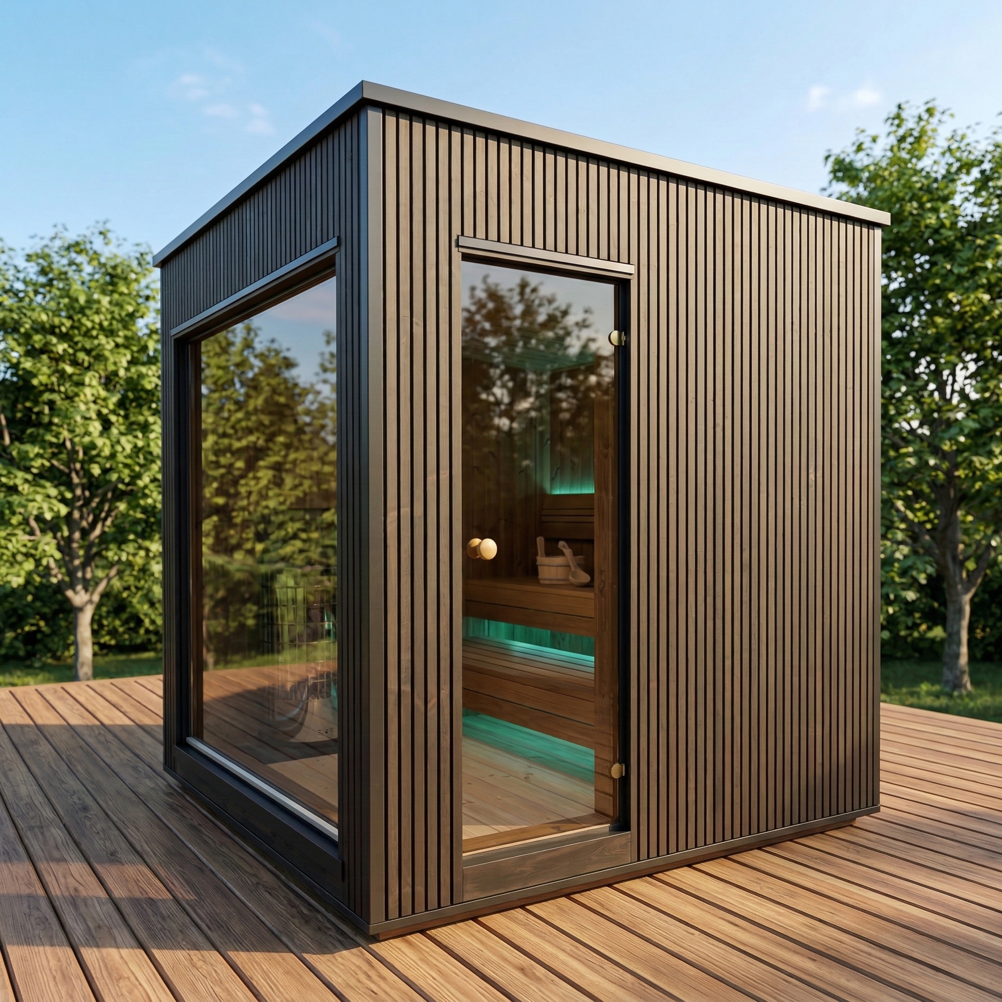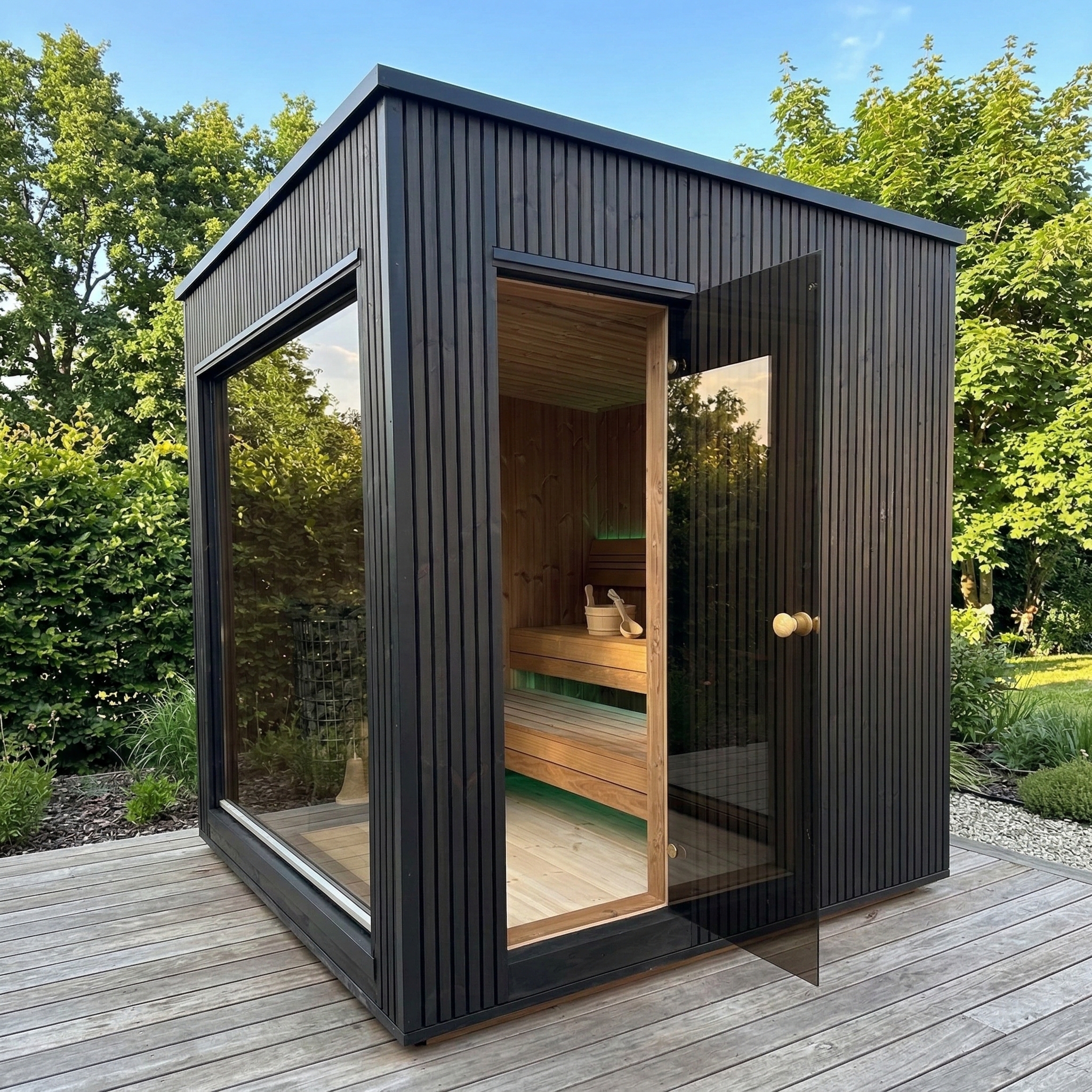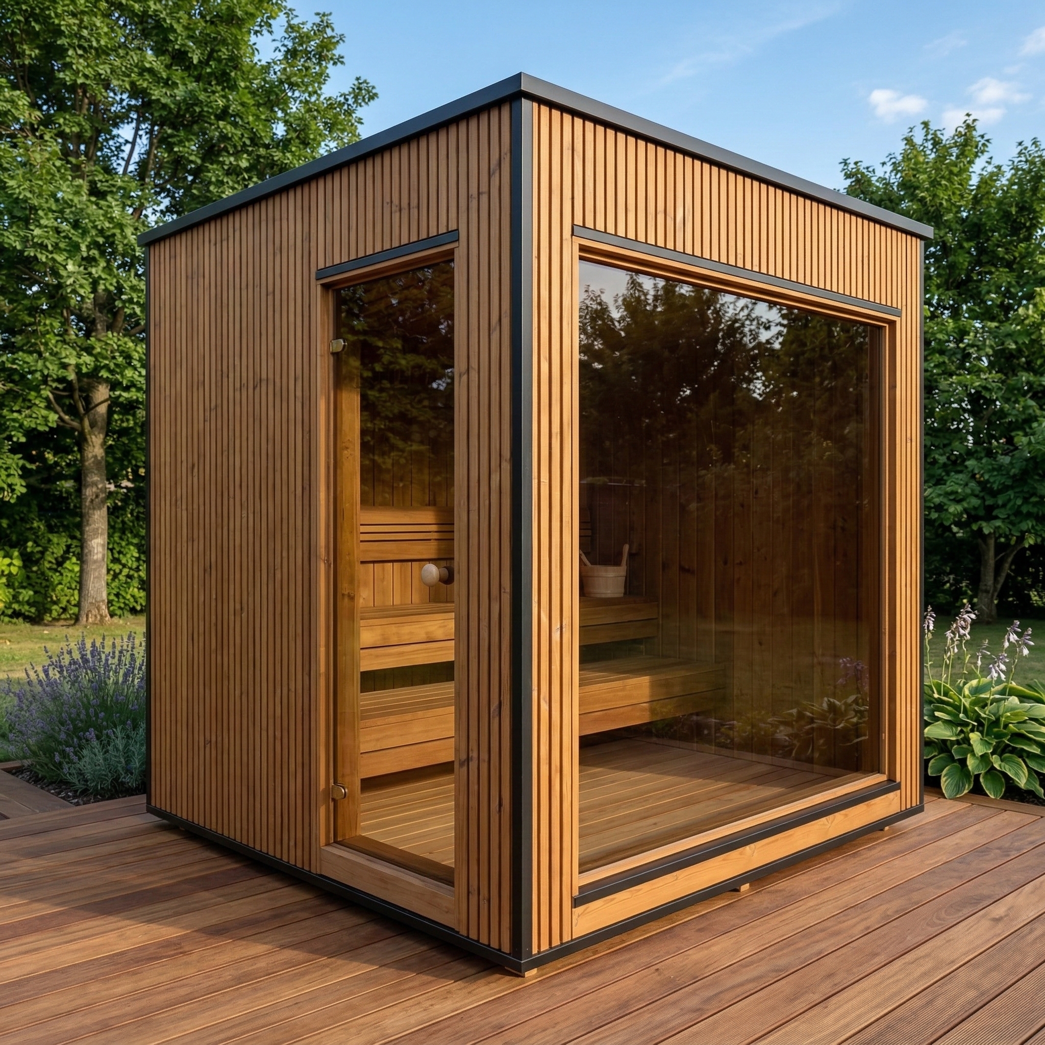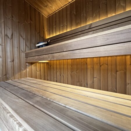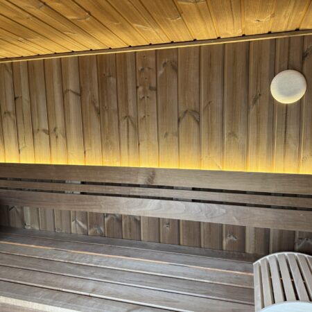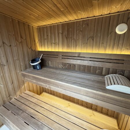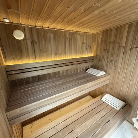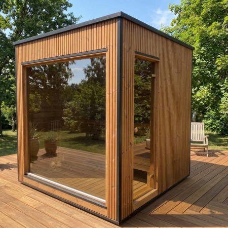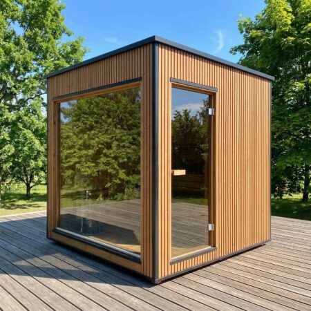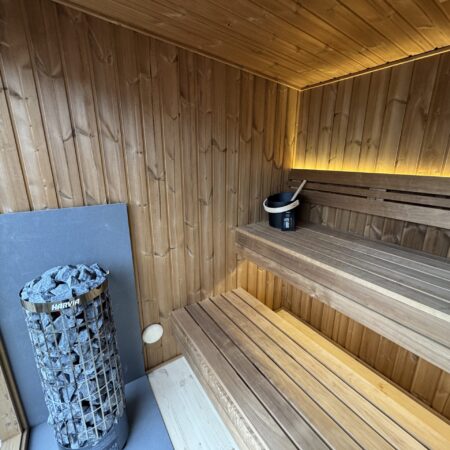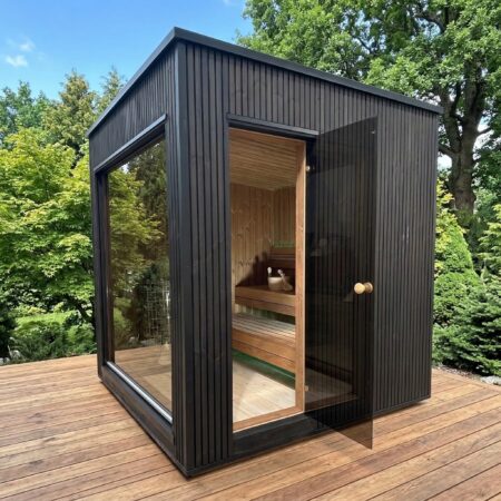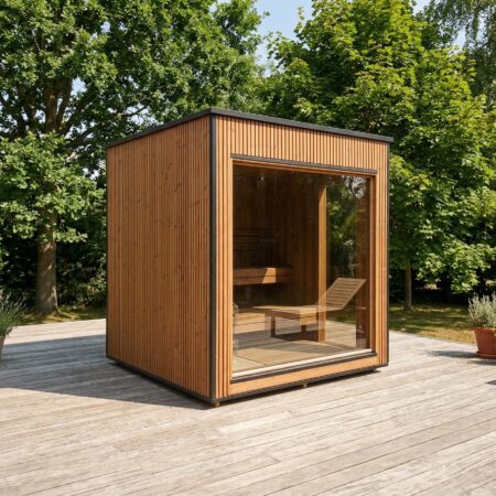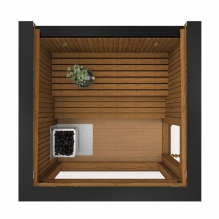 Fabriqué en Thermowood (bois traité thermiquement pour une durabilité extrême), il offre une résistance naturelle aux intempéries sans compromis esthétique. Sa façade monumentale en double vitrage trempé teinté de 1940 x 1940 mm abolit la frontière entre votre jardin et votre espace de soin, tout en préservant votre intimité. Idéal pour une séance à deux, ce sauna compact chauffe rapidement grâce à son isolation en laine de roche de 100 mm, garantissant une expérience de chaleur profonde et constante.