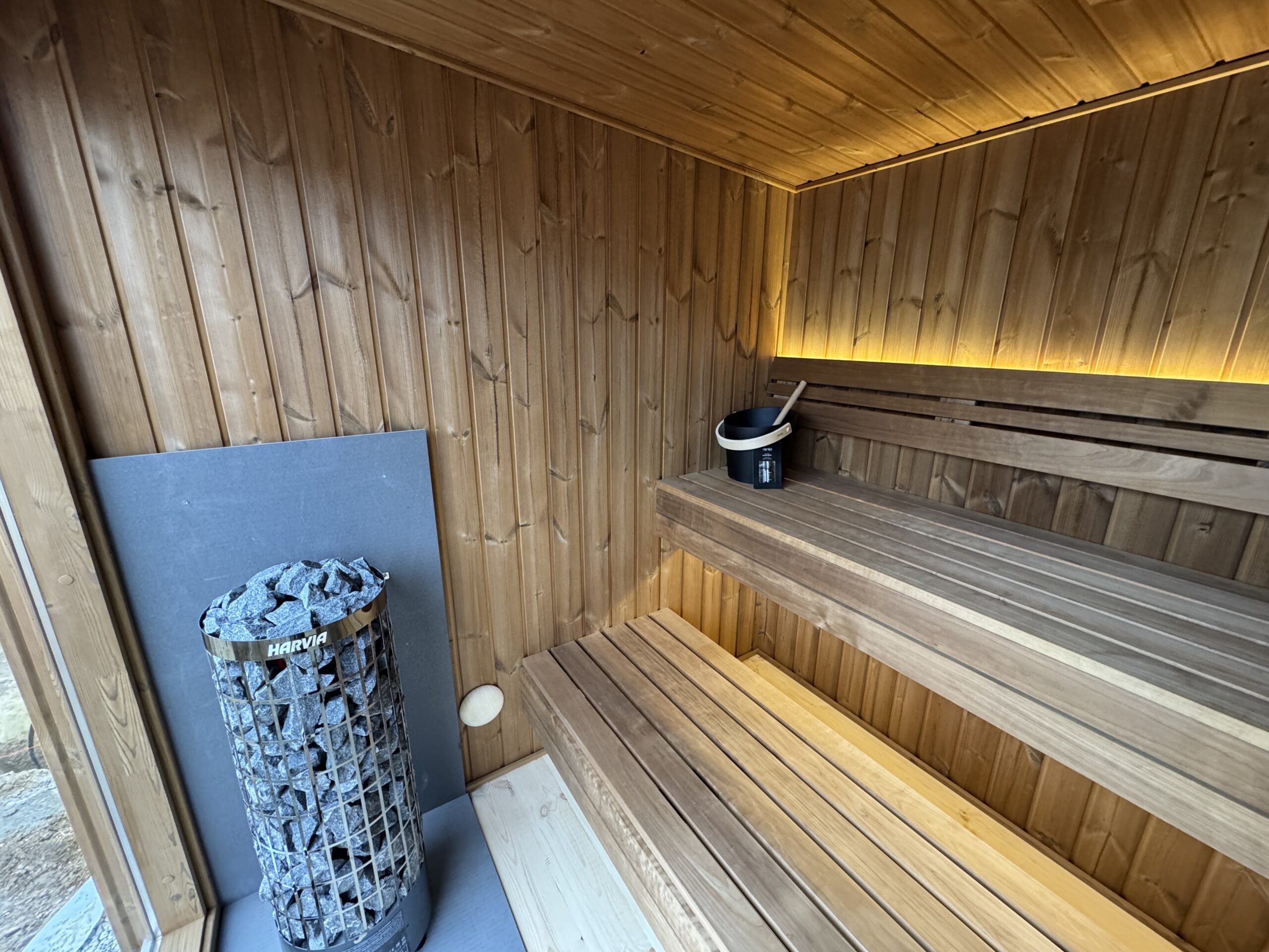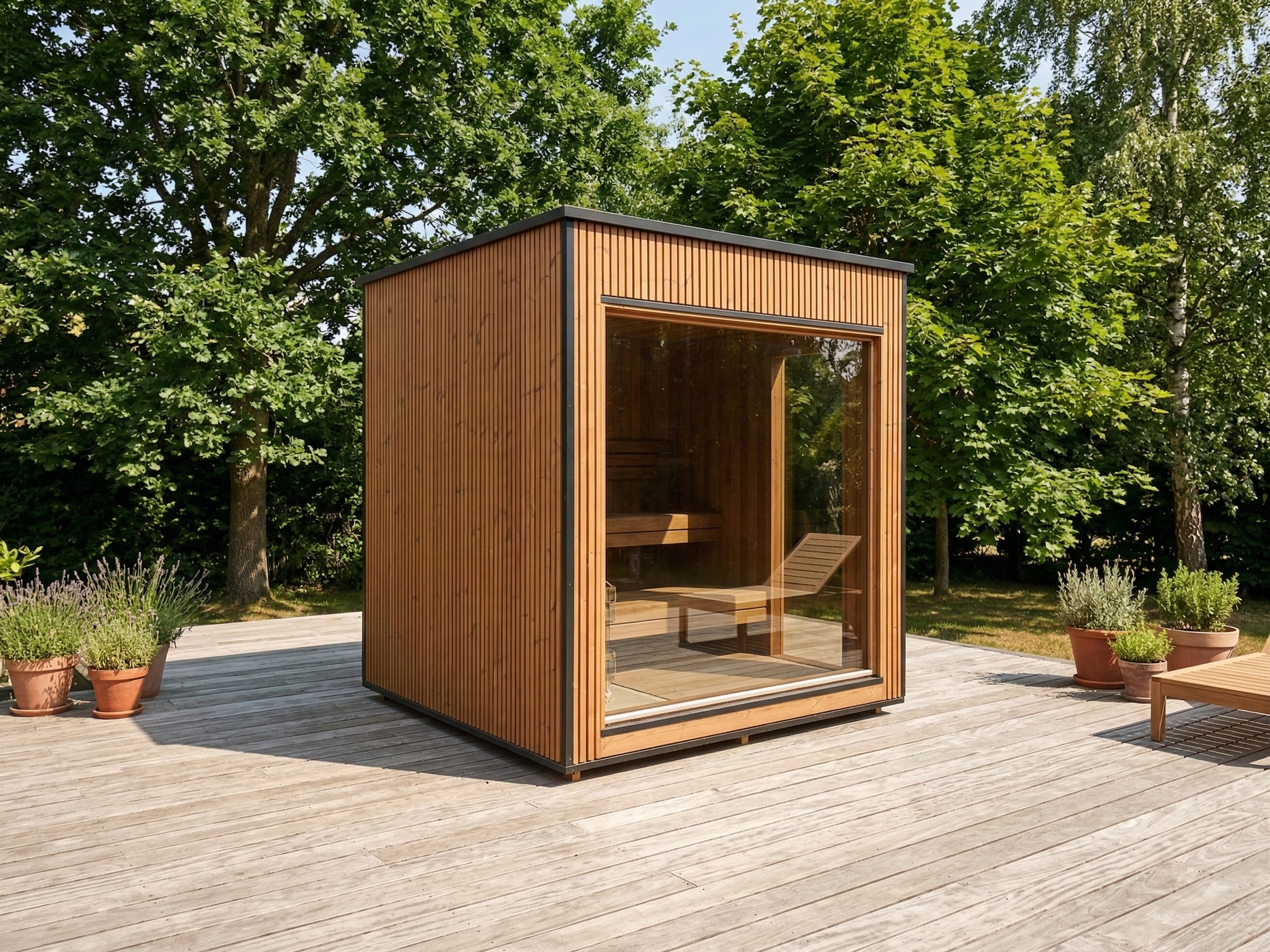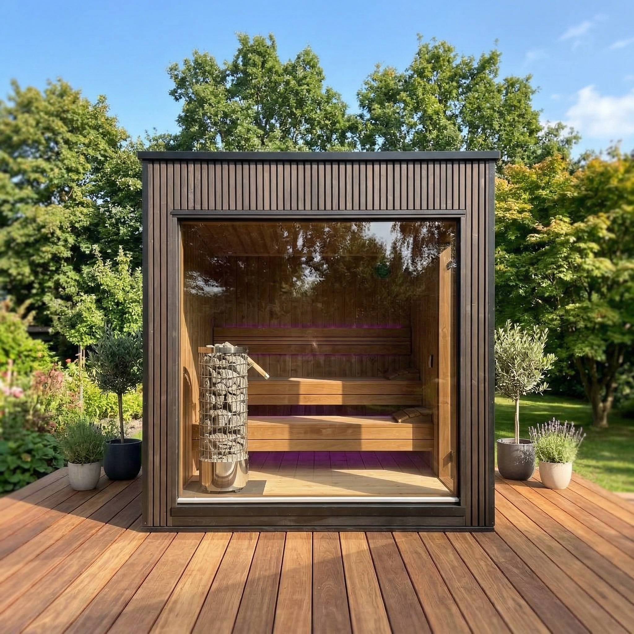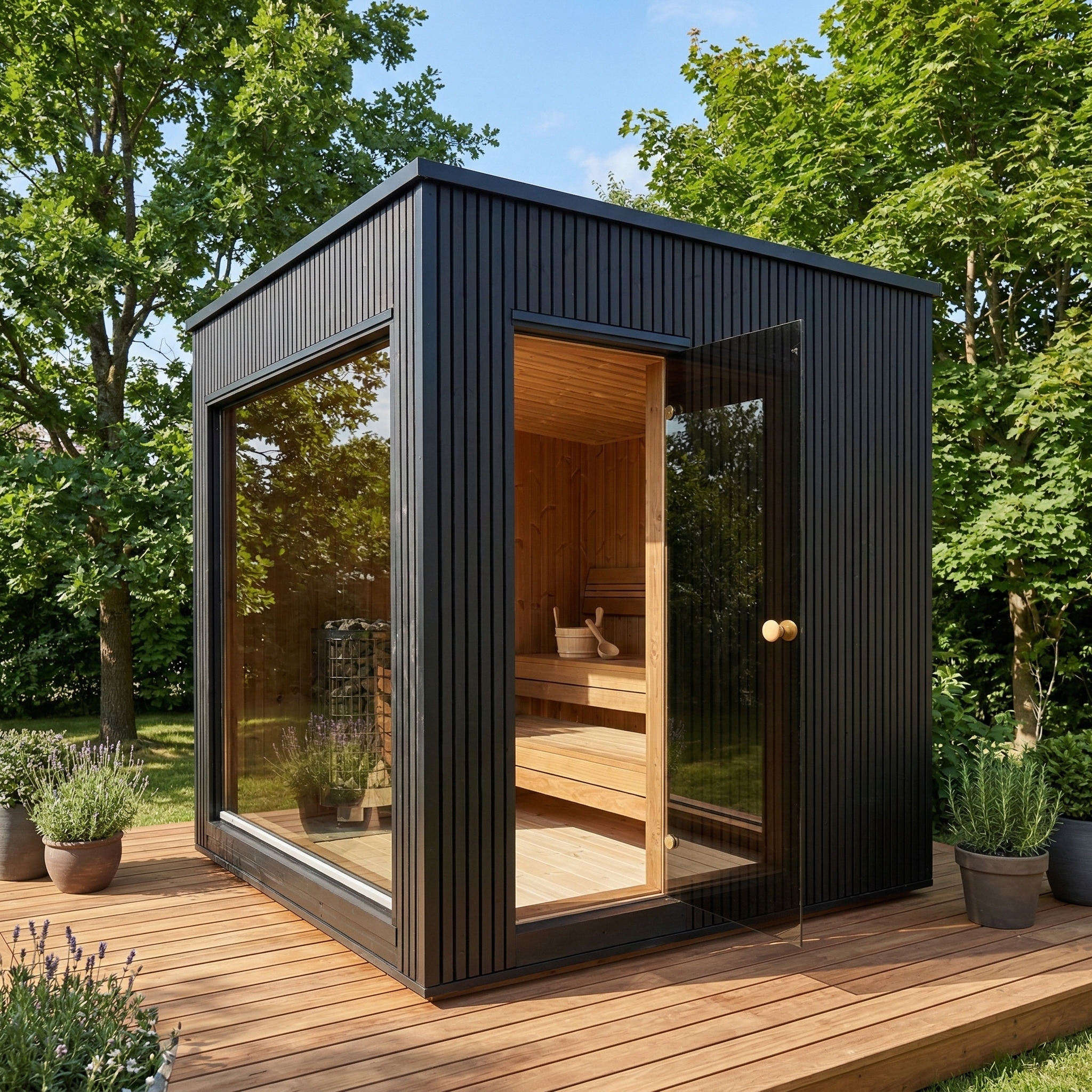 Fabriqué en Thermowood (bois traité thermiquement pour une durabilité extrême), il offre une résistance naturelle aux intempéries sans compromis esthétique. Sa façade monumentale en double vitrage trempé teinté de 1940 x 1940 mm abolit la frontière entre votre jardin et votre espace de soin, tout en préservant votre intimité. Idéal pour une séance à deux, ce sauna compact chauffe rapidement grâce à son isolation en laine de roche de 100 mm, garantissant une expérience de chaleur profonde et constante.