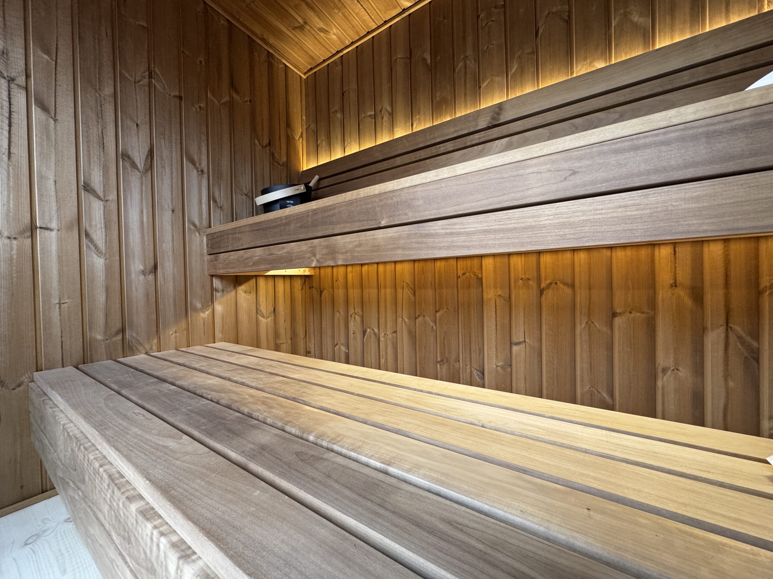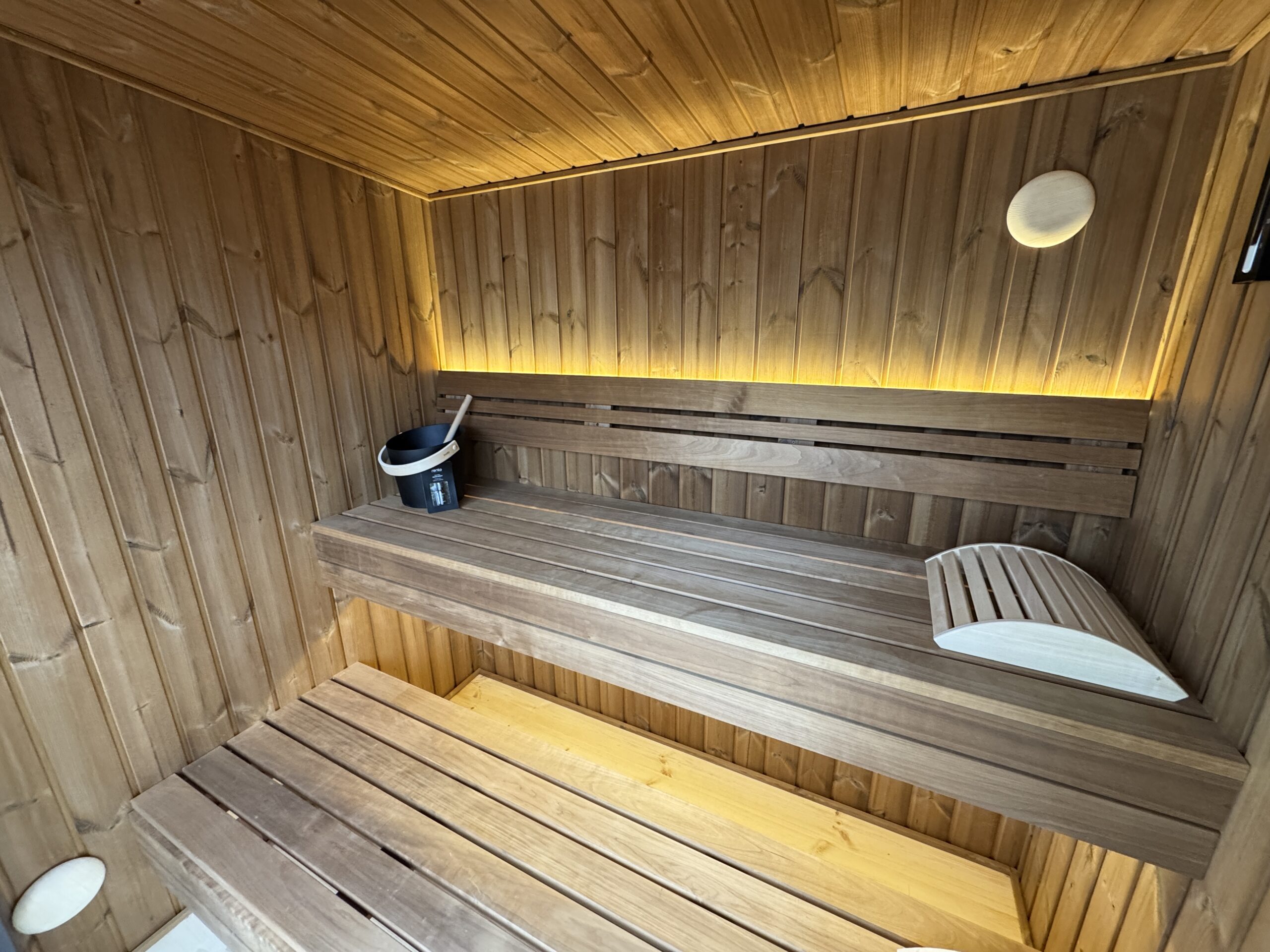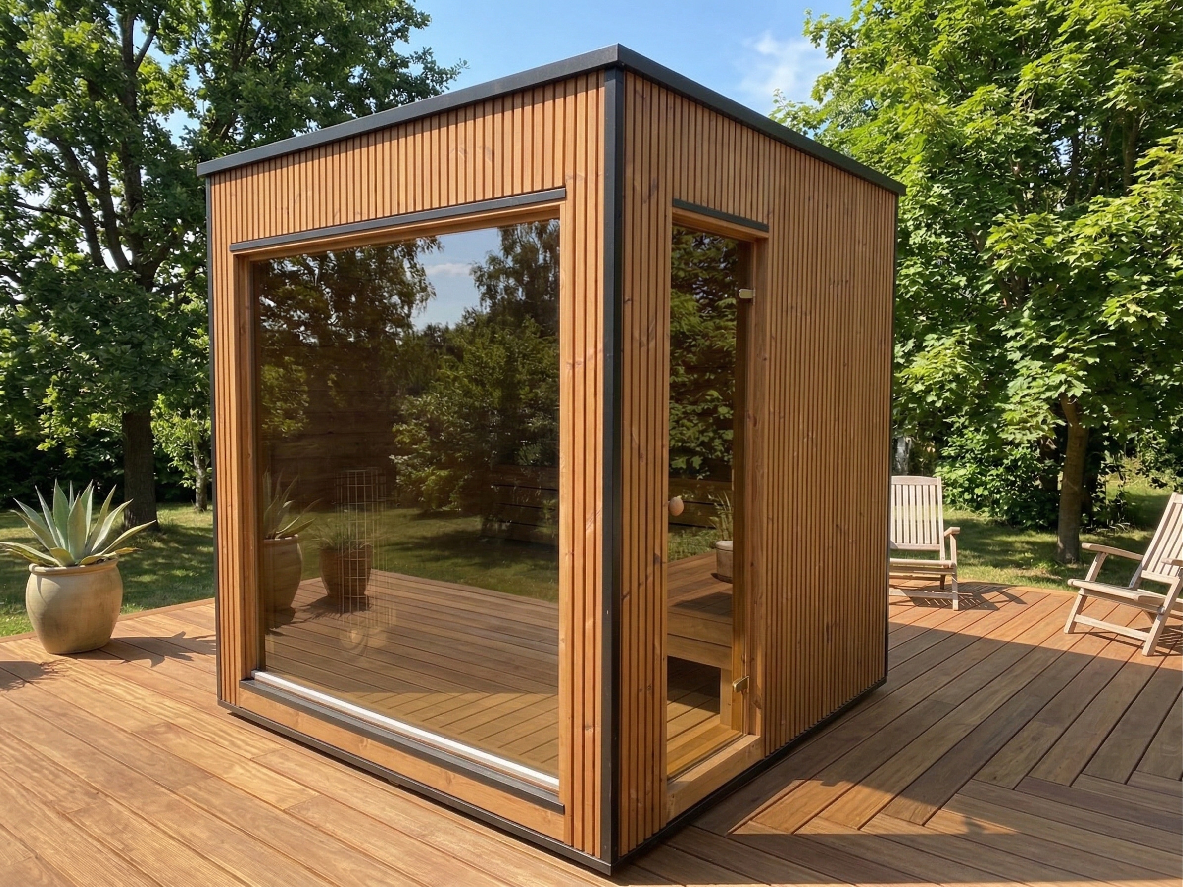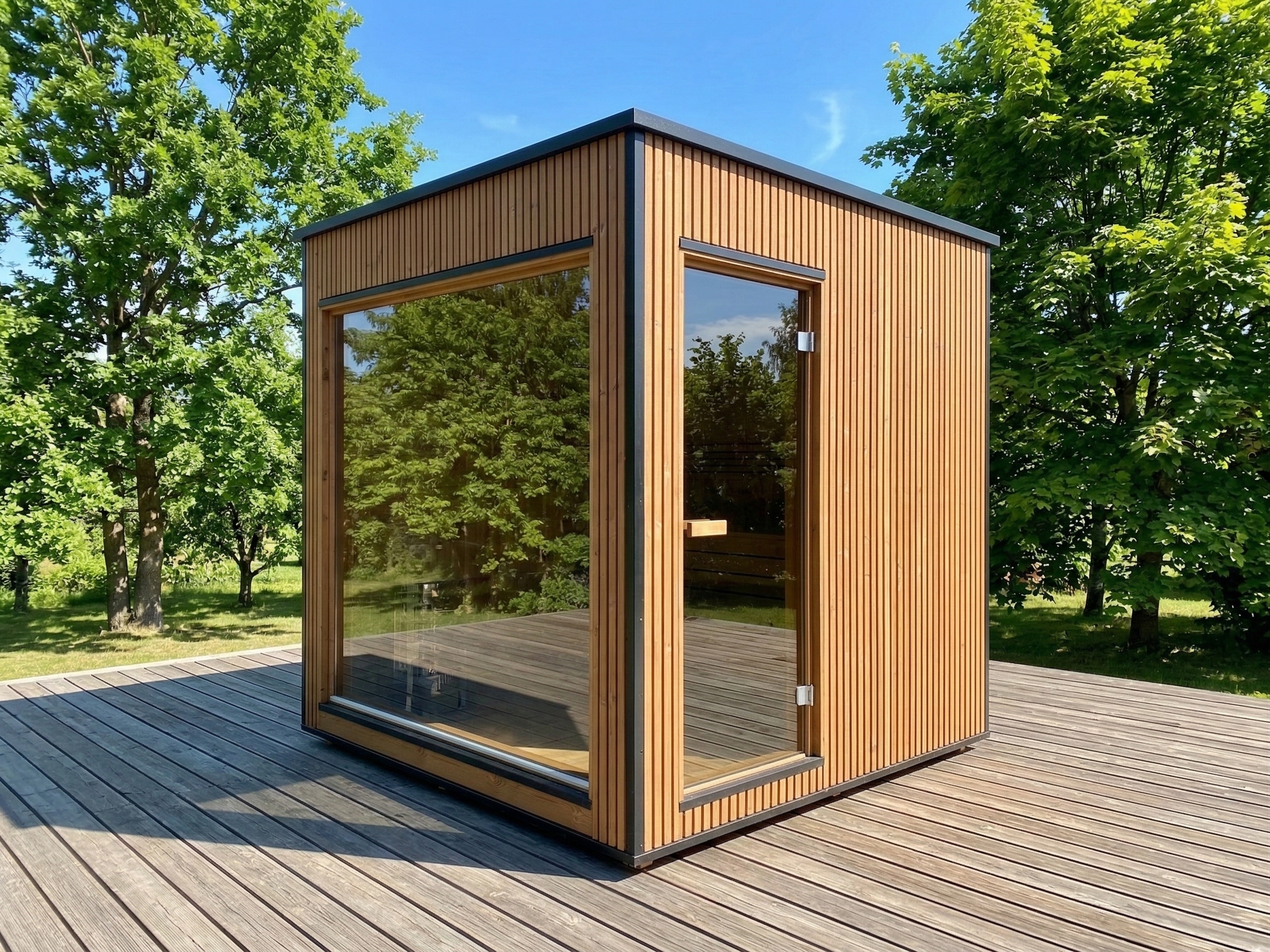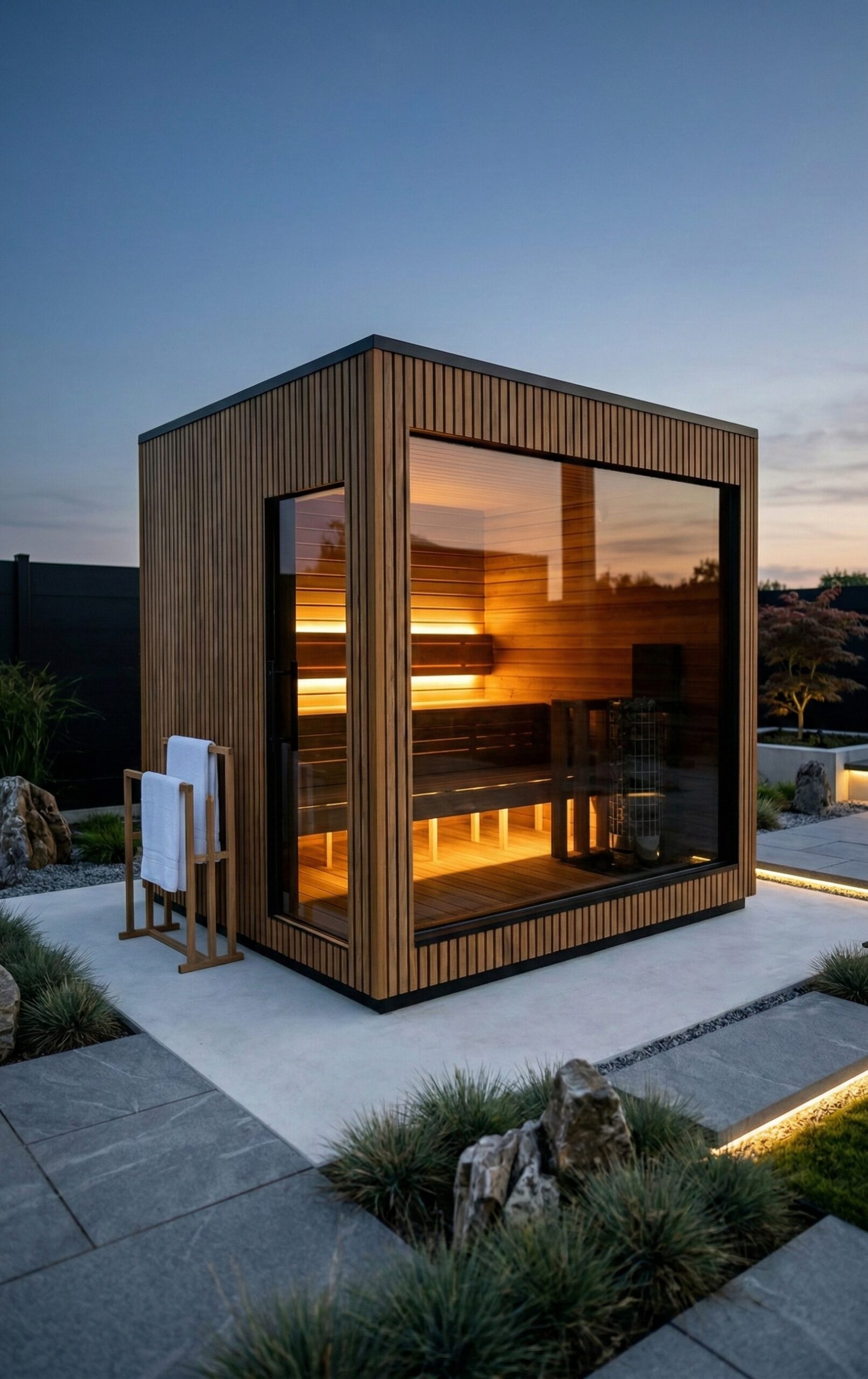 Fabriqué en Thermowood (bois traité thermiquement pour une durabilité extrême), il offre une résistance naturelle aux intempéries sans compromis esthétique. Sa façade monumentale en double vitrage trempé teinté de 1940 x 1940 mm abolit la frontière entre votre jardin et votre espace de soin, tout en préservant votre intimité. Idéal pour une séance à deux, ce sauna compact chauffe rapidement grâce à son isolation en laine de roche de 100 mm, garantissant une expérience de chaleur profonde et constante.