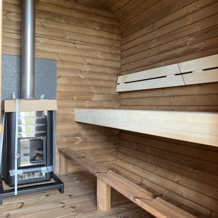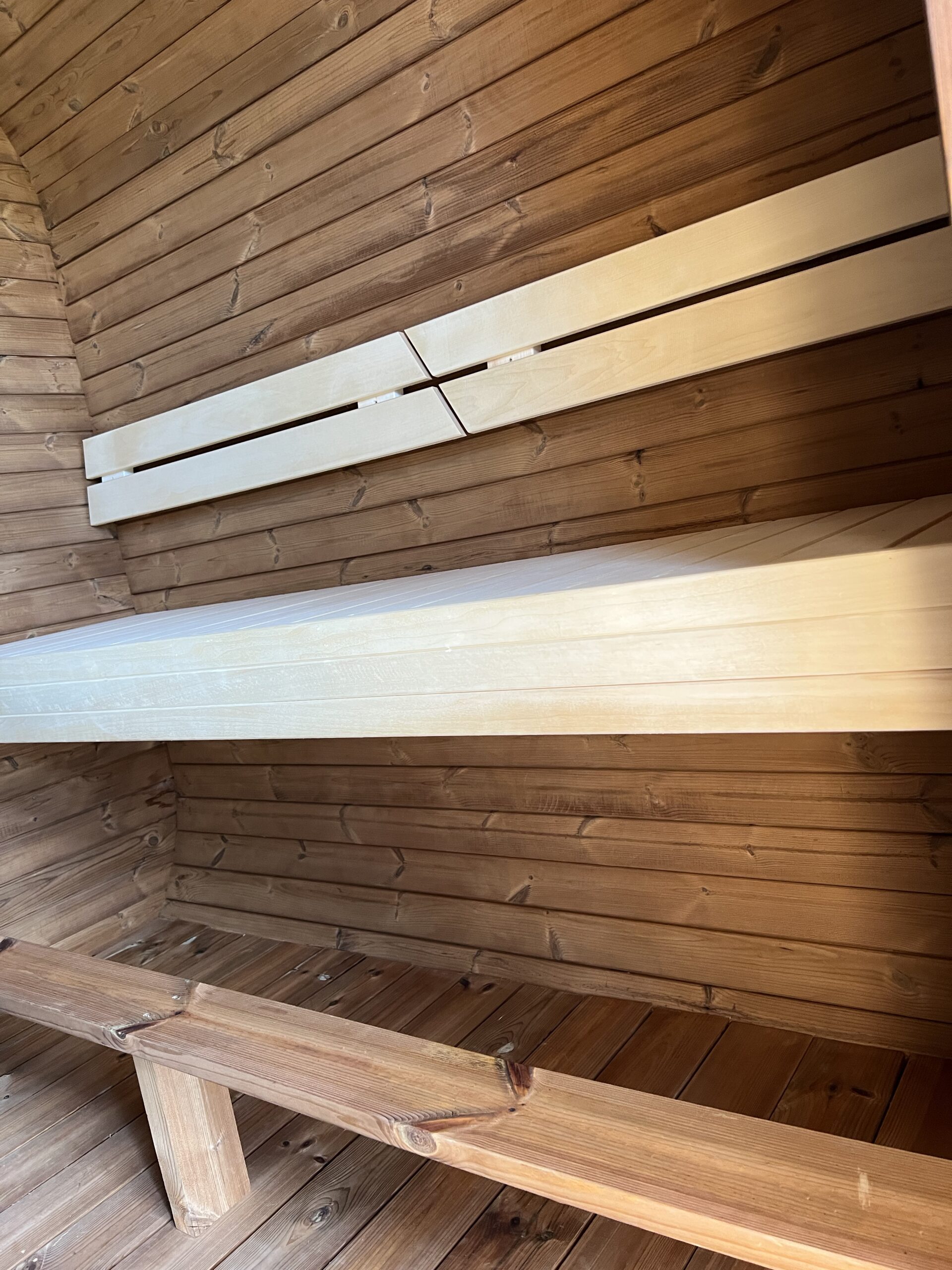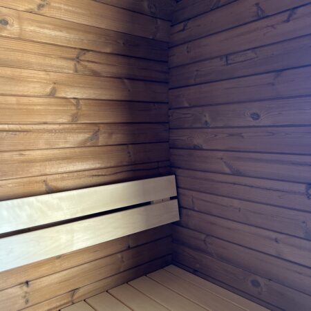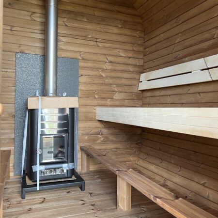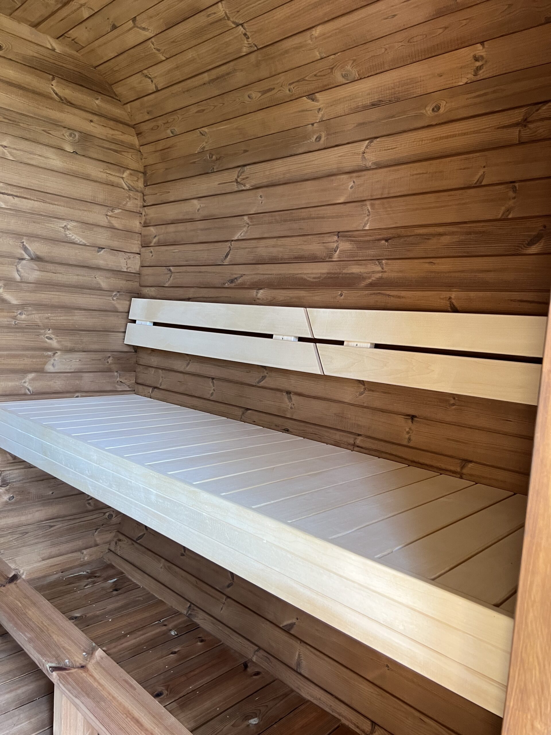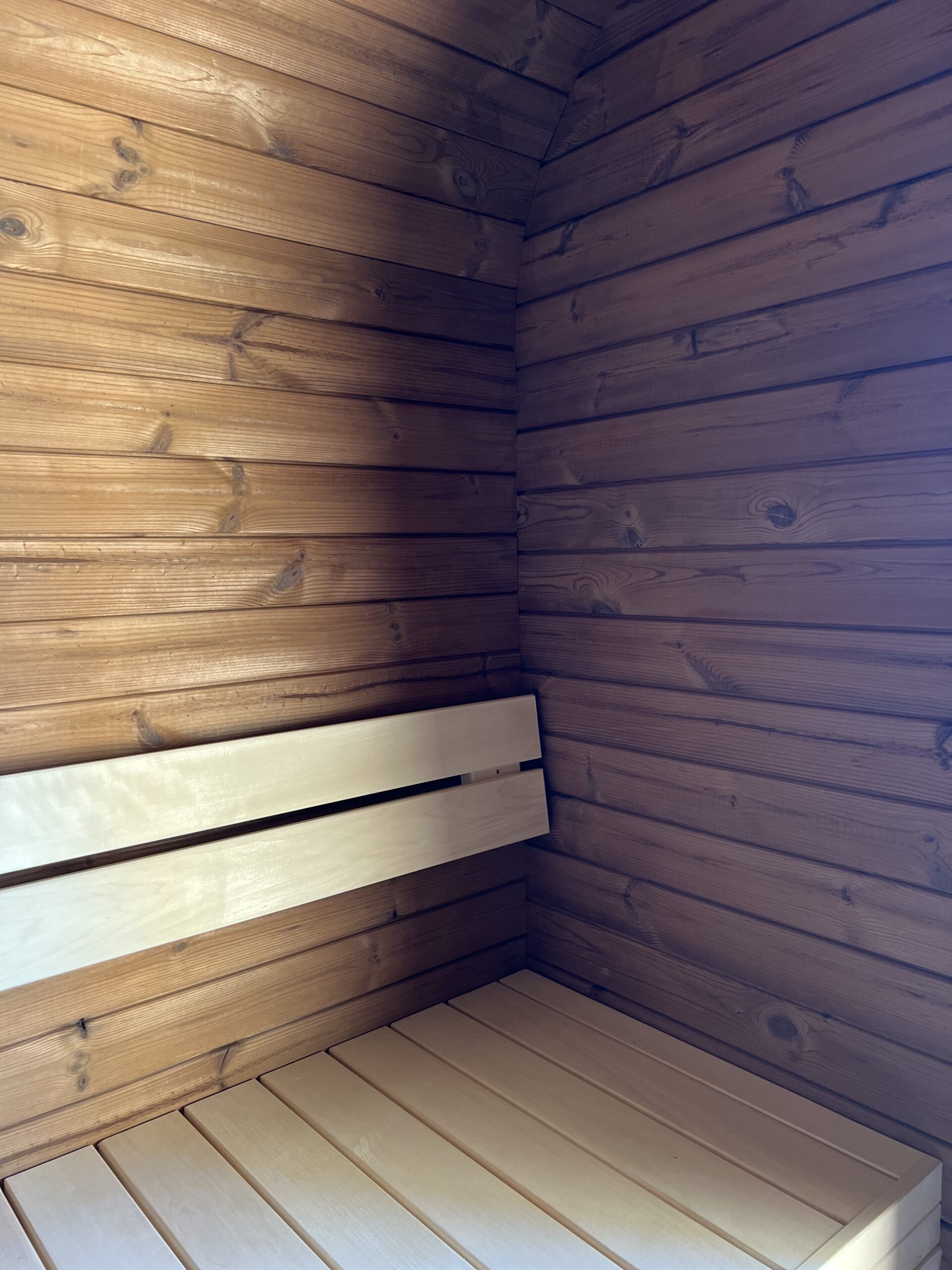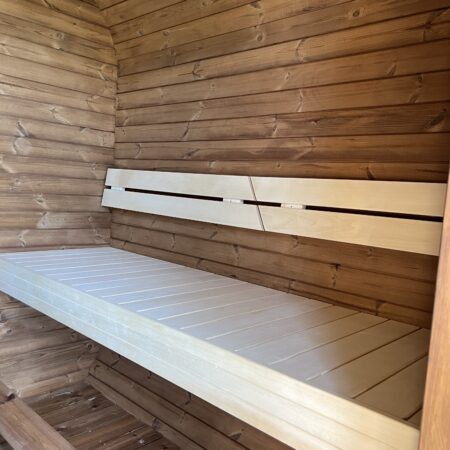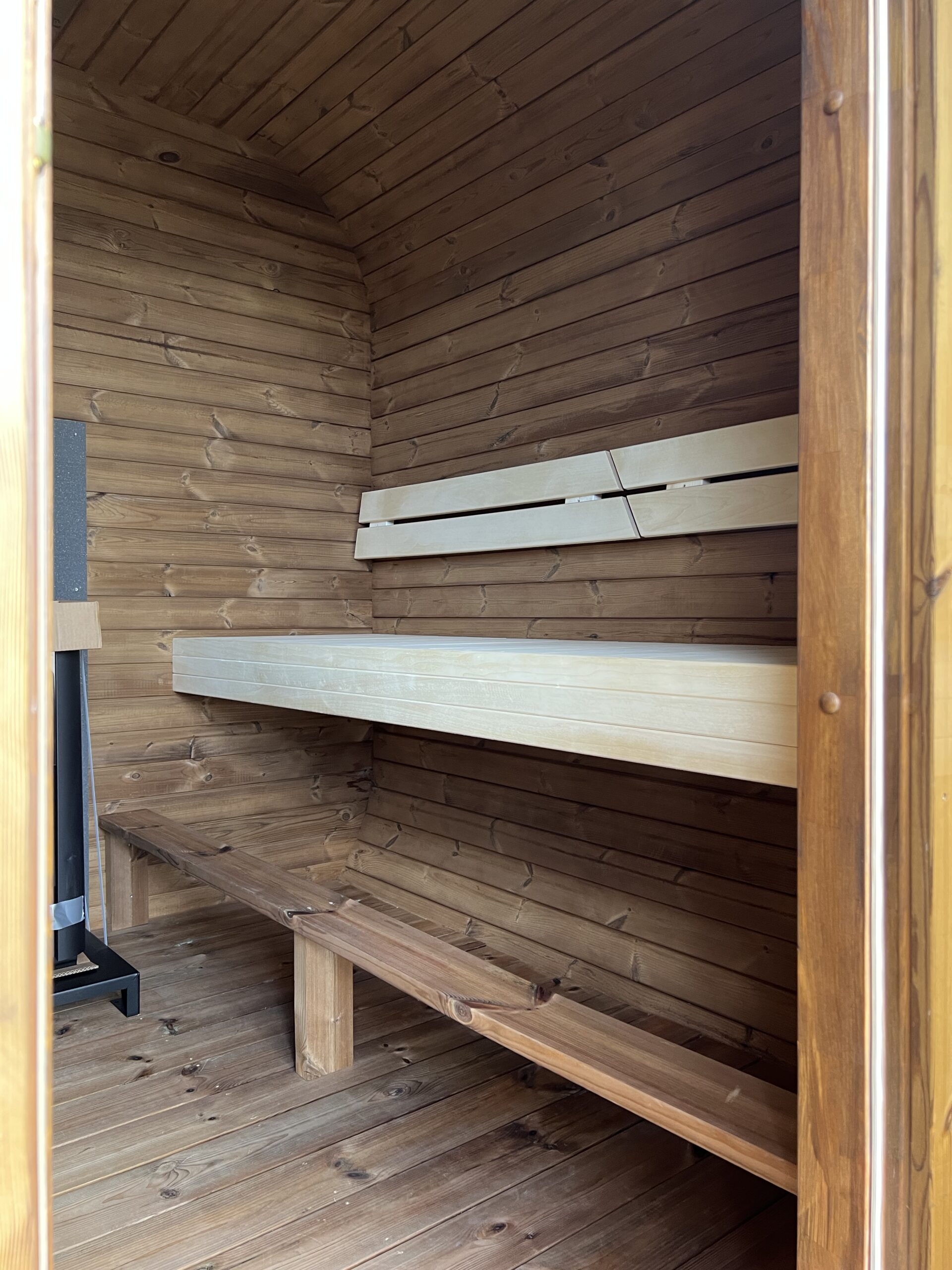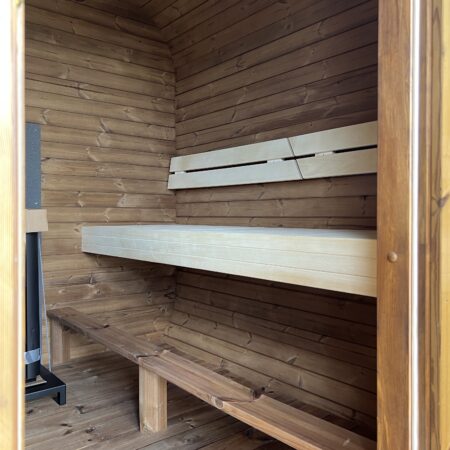 À l'intérieur, vous trouverez un espace bien conçu avec un sol en planches de 27 mm, offrant une surface solide et agréable sous vos pieds. La porte d'entrée en verre trempé et teinté de 6 mm crée une liaison transparente entre l'intérieur et l'extérieur tout en créant une ambiance apaisante. Les bancs en bois de tremble ou d'aulne noir vous invitent à vous détendre confortablement.