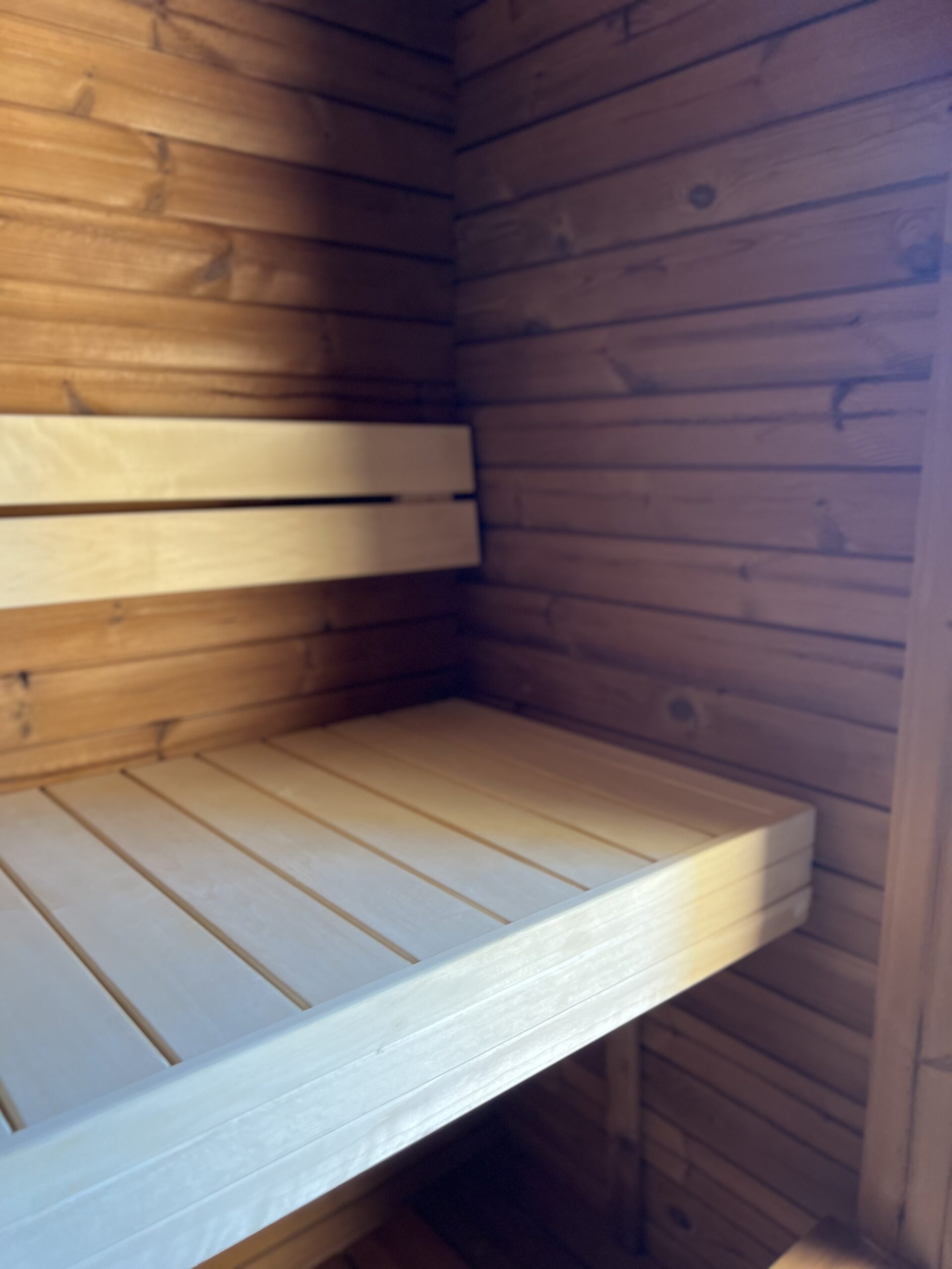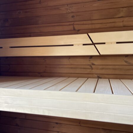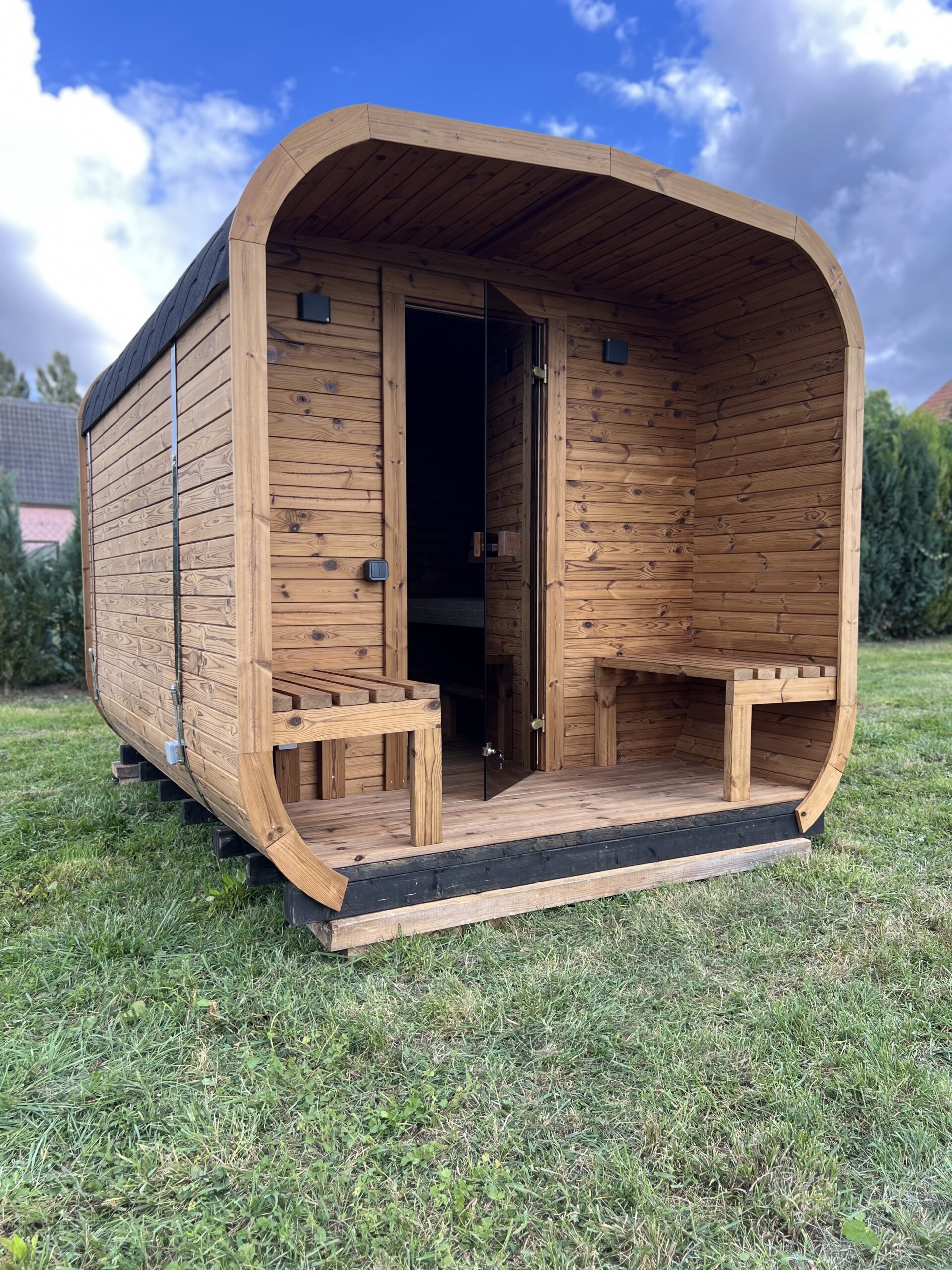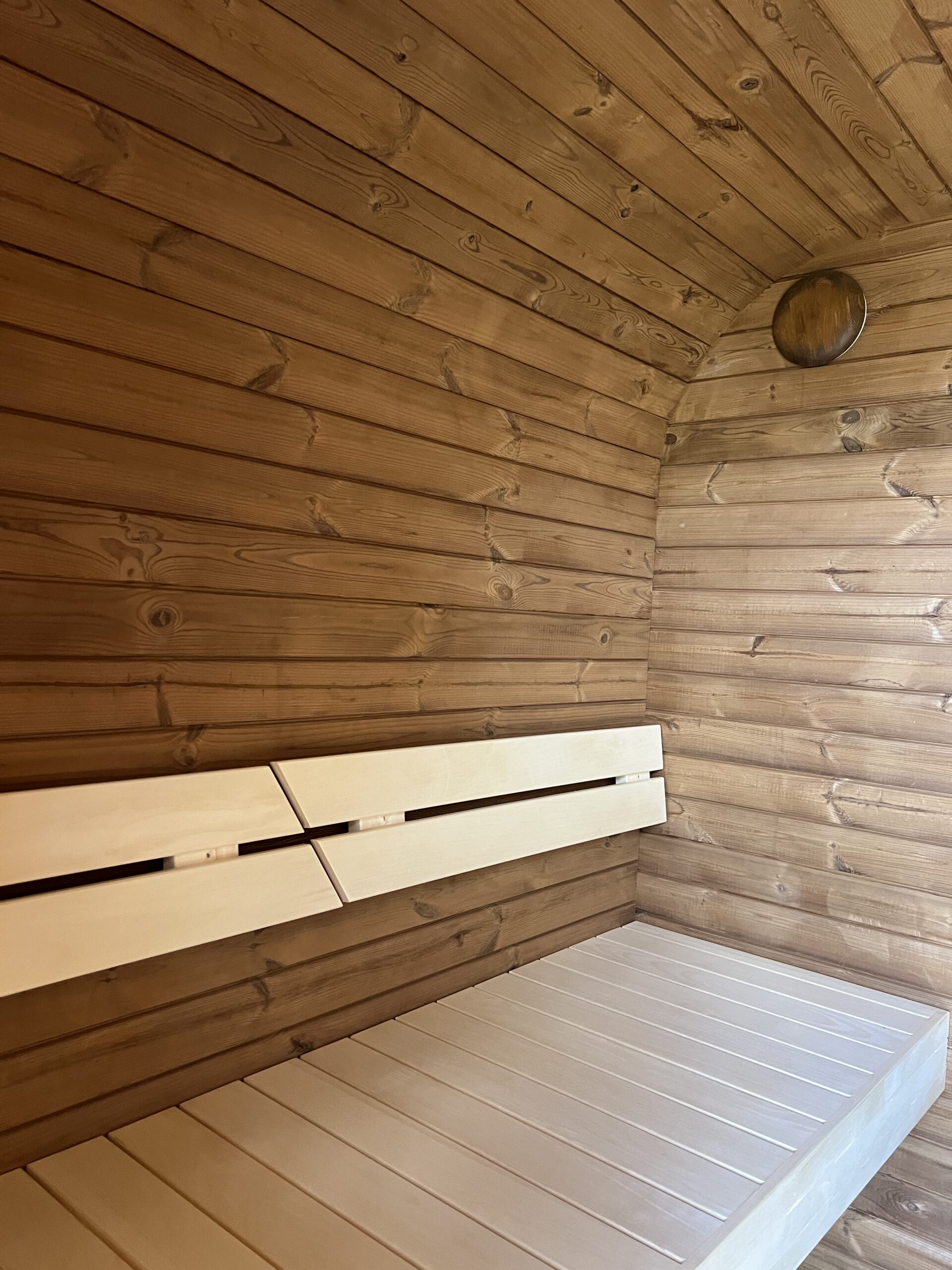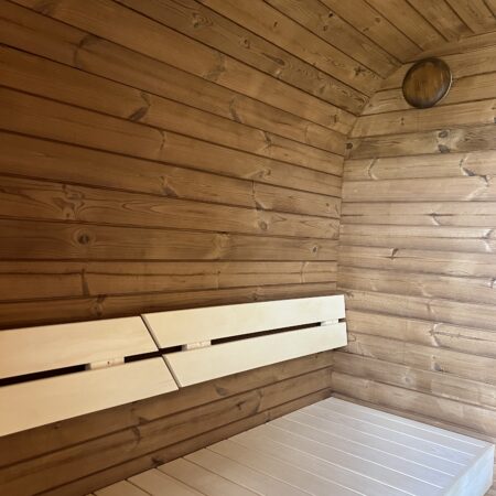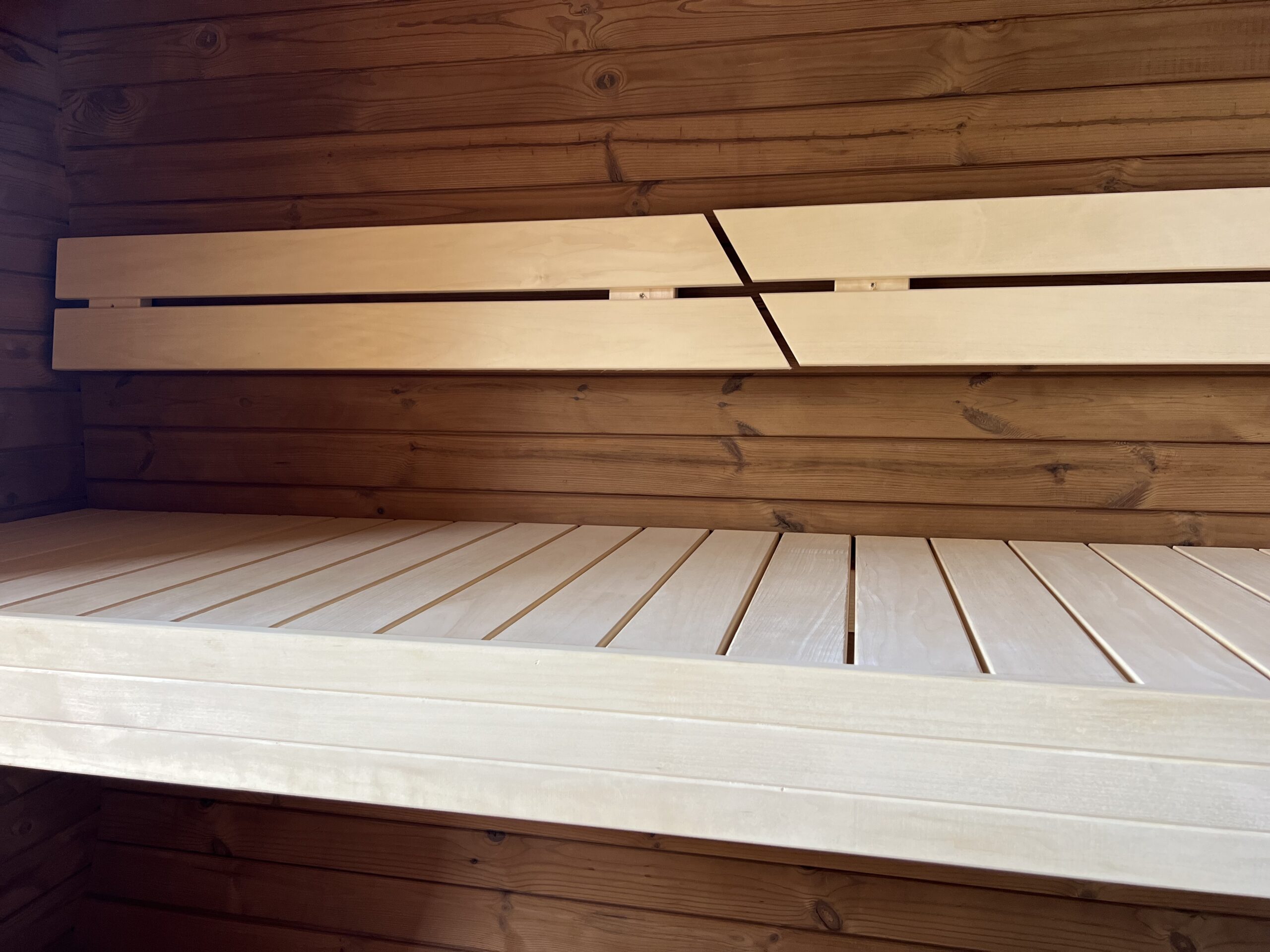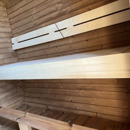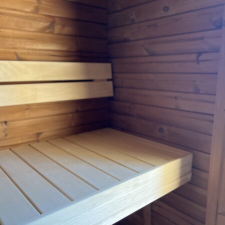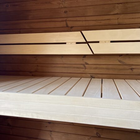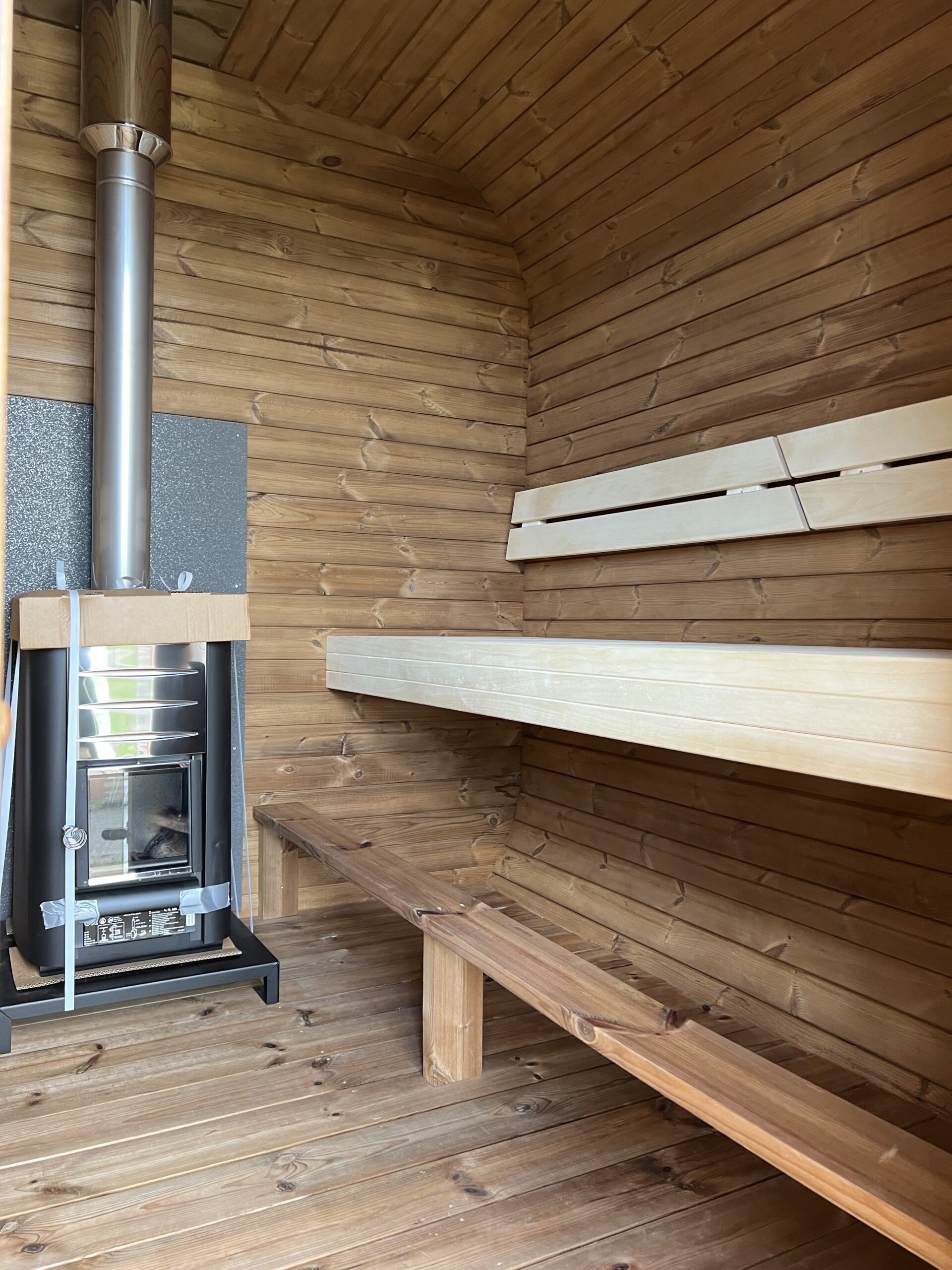 À l'intérieur, vous trouverez un espace bien conçu avec un sol en planches de 27 mm, offrant une surface solide et agréable sous vos pieds. La porte d'entrée en verre trempé et teinté de 6 mm crée une liaison transparente entre l'intérieur et l'extérieur tout en créant une ambiance apaisante. Les bancs en bois de tremble ou d'aulne noir vous invitent à vous détendre confortablement.