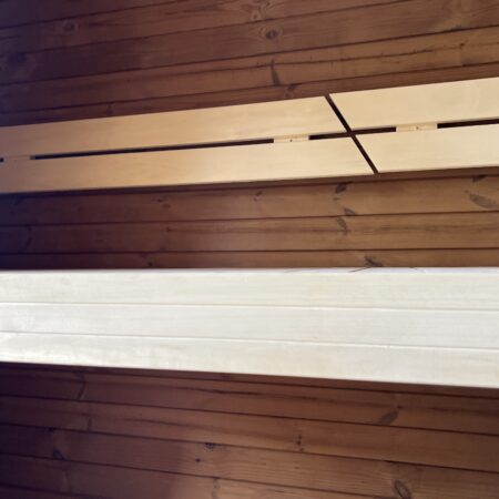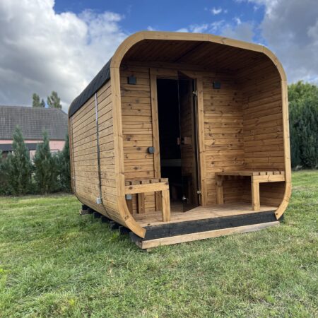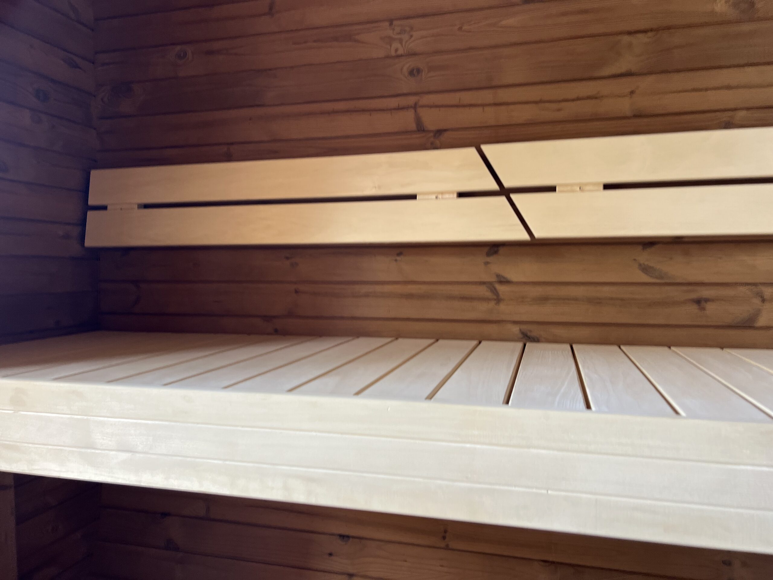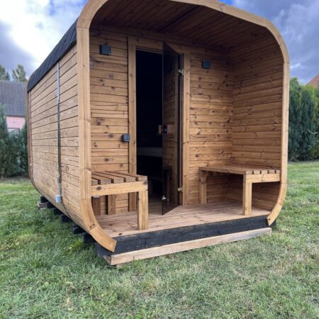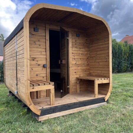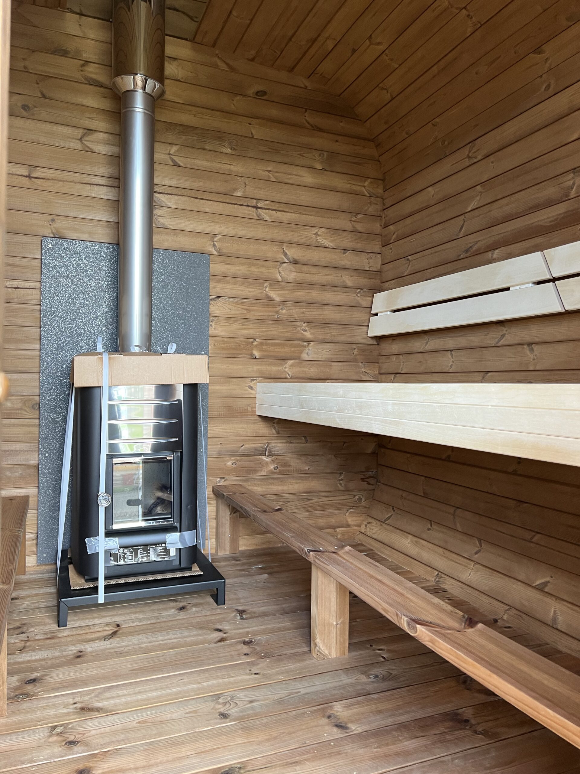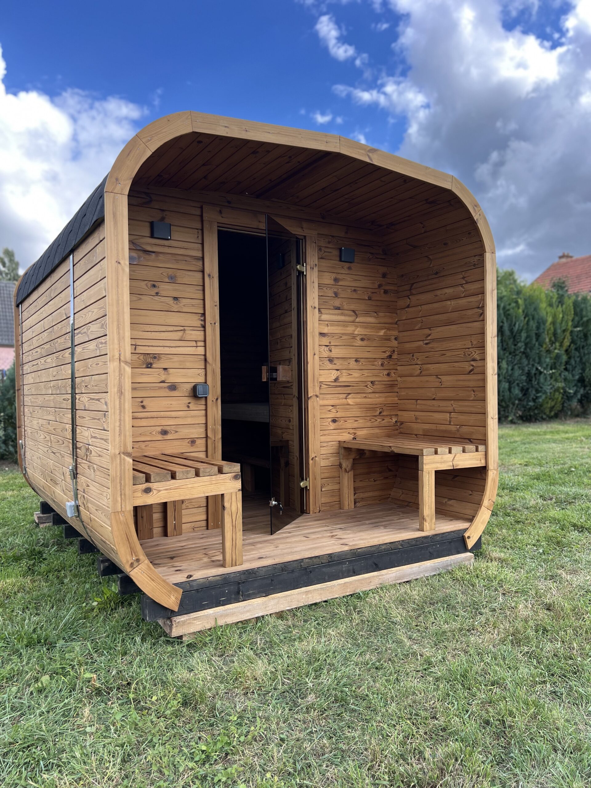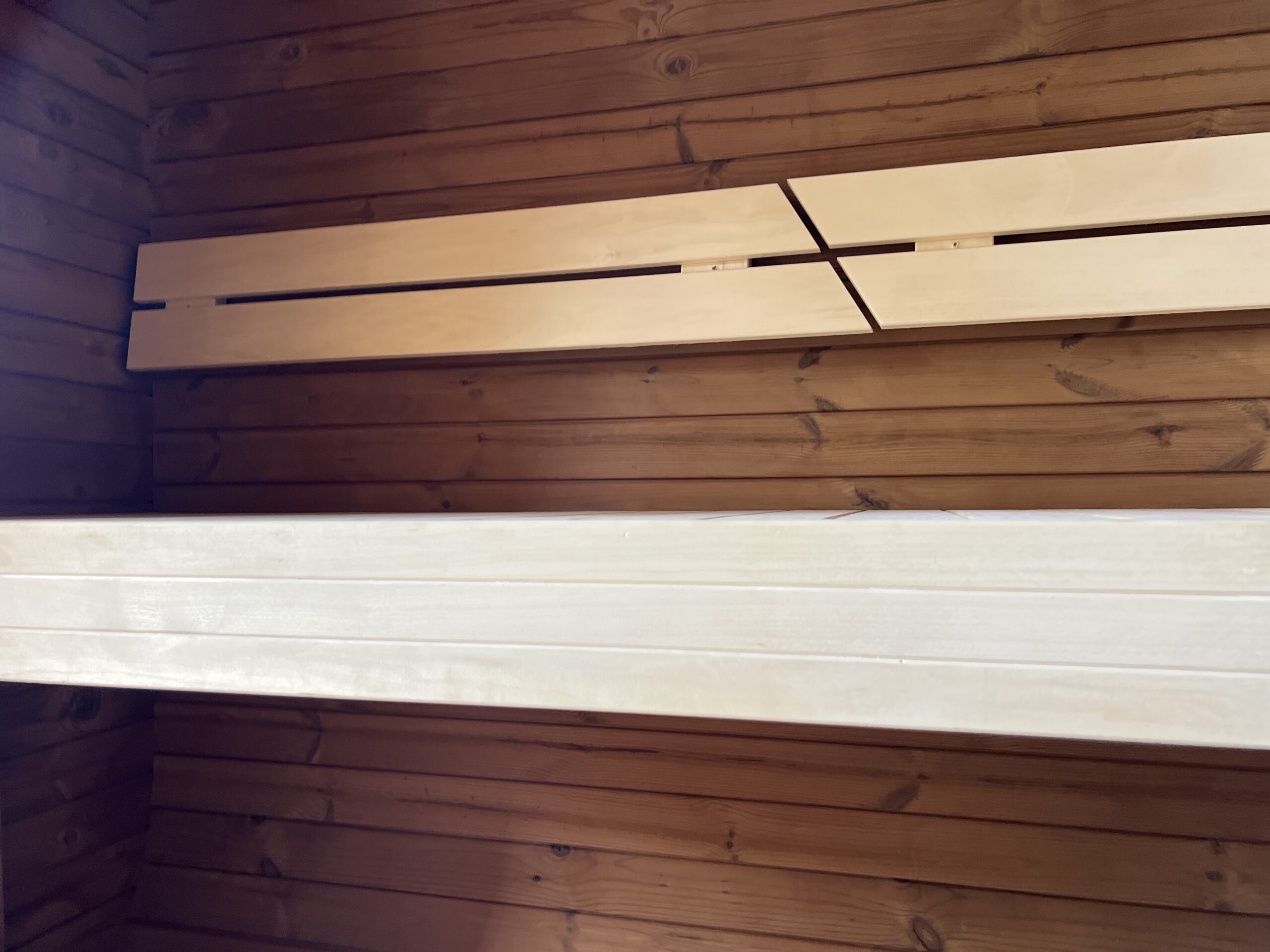 À l'intérieur, vous trouverez un espace bien conçu avec un sol en planches de 27 mm, offrant une surface solide et agréable sous vos pieds. La porte d'entrée en verre trempé et teinté de 6 mm crée une liaison transparente entre l'intérieur et l'extérieur tout en créant une ambiance apaisante. Les bancs en bois de tremble ou d'aulne noir vous invitent à vous détendre confortablement.